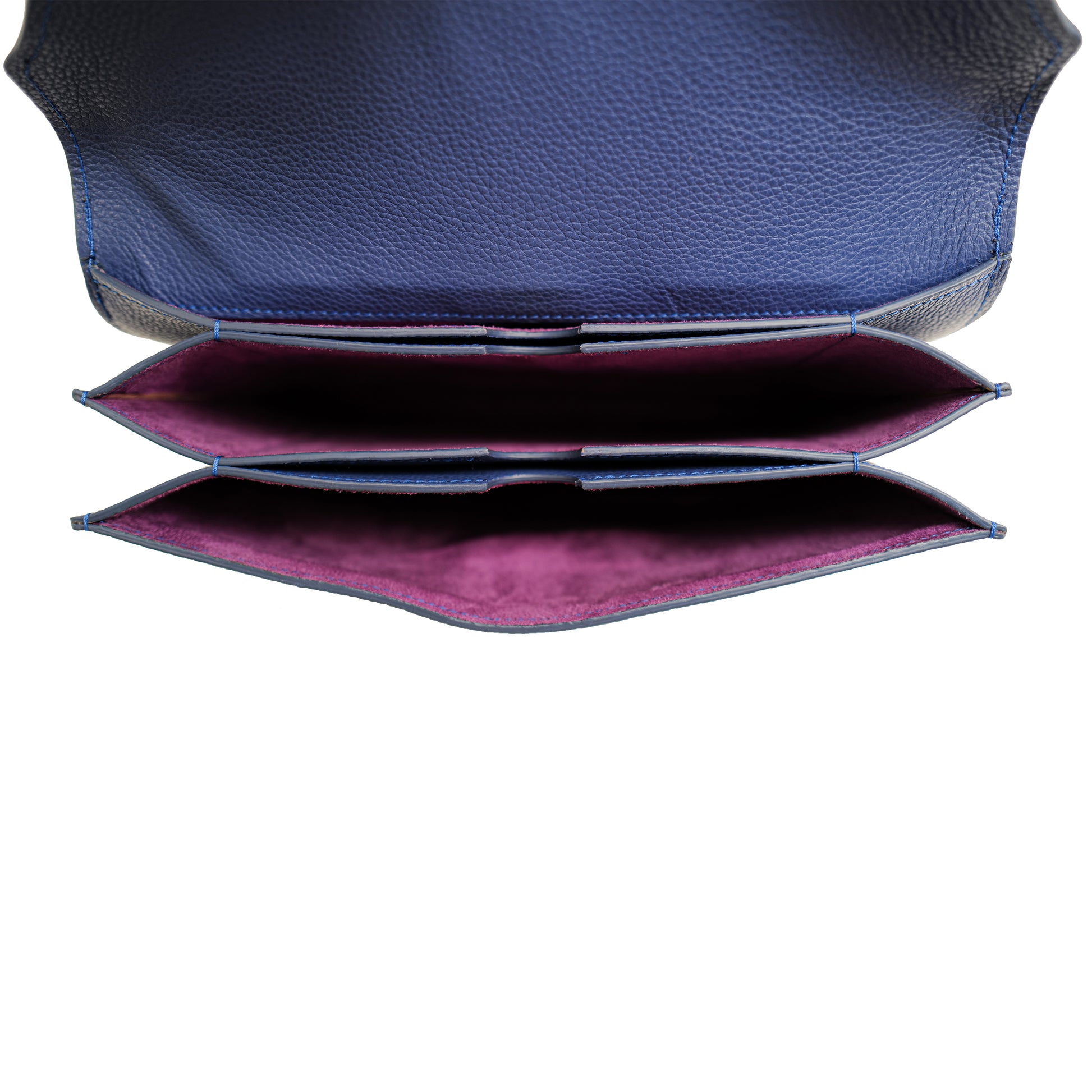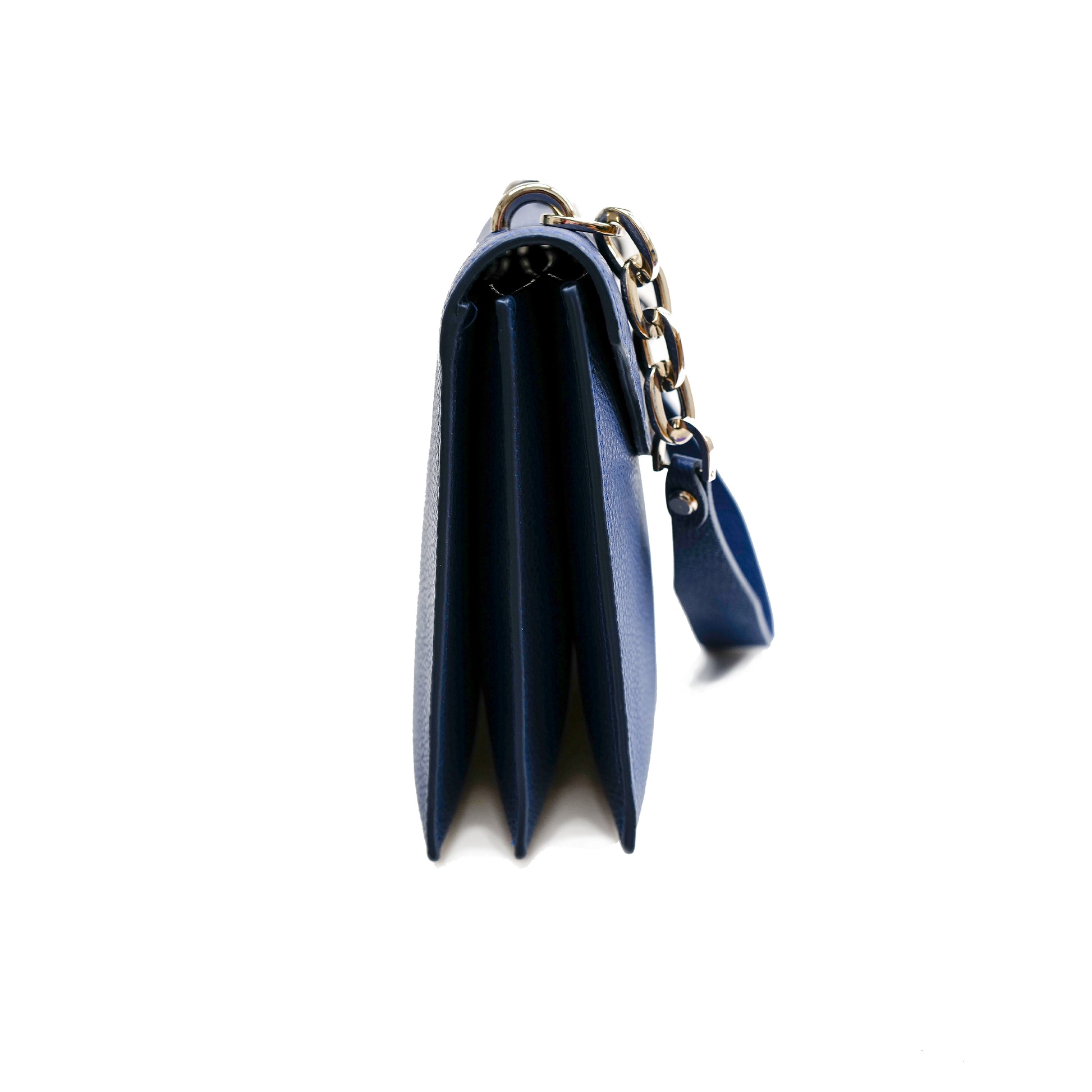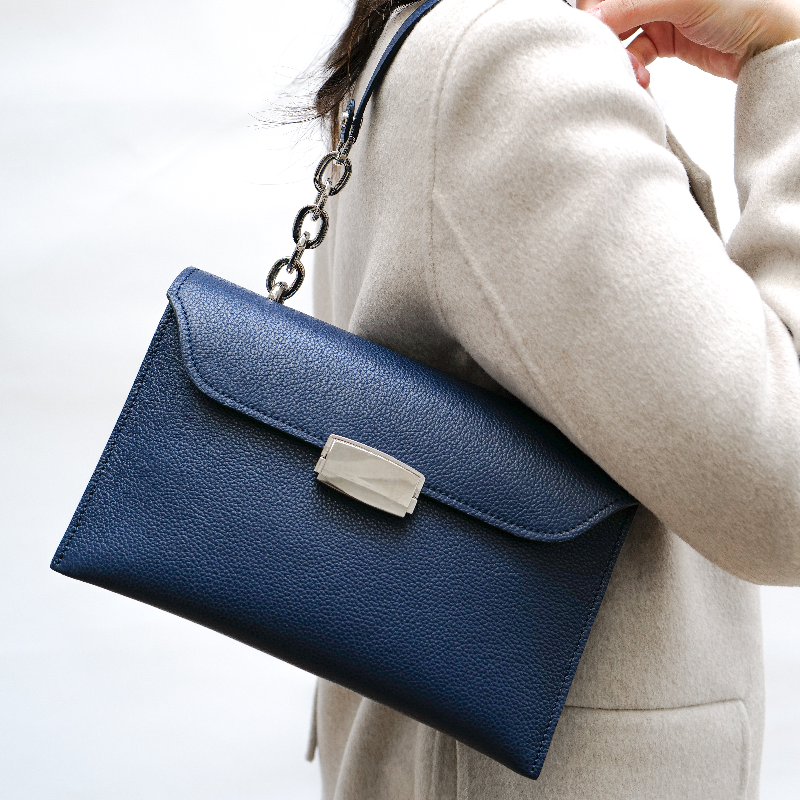 This navy Gabriel Shoulder Handbag is handcrafted in the UK and features a shoulder strap, fold-over flap top, silver-tone hardware and lock closure. Unlike other collections, this timeless and elegant envelope bag will never go out of style.